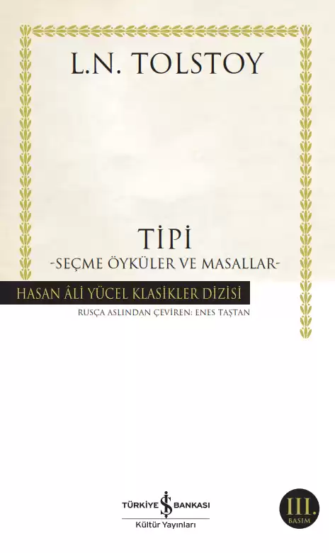 Lev Nikolayeviç Tolstoy (1828-1910): Anna Karenina, Savaş ve Barış, Diriliş’in büyük yazarı, yaşamının son otuz yılında kendini insan, aile, din, devlet, toplum, özgürlük, boyun eğme, başkaldırma, sanat ve estetik konularında kuramsal çalışmalara da verdi. Bu dönemde yazdığı roman ve öykülerinde yıllarca üzerinde düşündüğü insanlık sorunlarını; edebi bir kurguyla ele aldı. Tipi -Seçme Öyküler ve Masallar- Tolstoy’un yaşam ve eserlerinin farklı dönemlerdeki yansımalarından kronolojik bir seçki niteliği taşımaktadır. Yazarın en ünlü; en beğenilen öykülerinden olan Tipi; Tolstoy eserlerine özgü doğa ve insan tasvirlerindeki ayrıntı ve gerçekliğin belki de doruk noktasıdır. Diğer öykü Luzern ise edebi açıdan olduğu kadar Tolstoy’un dünya görüşünü yansıtması açısından da değerlidir. Toplumsal ve felsefi konularla daha çok ilgilenmeye başladığı dönemlerde yazdığı Irgat Yemelyan ve Boş Davul, Üç Mesel ve Üç Soru eserlerindeyse; halk masalları ve kıssalardan esinlenmiştir.